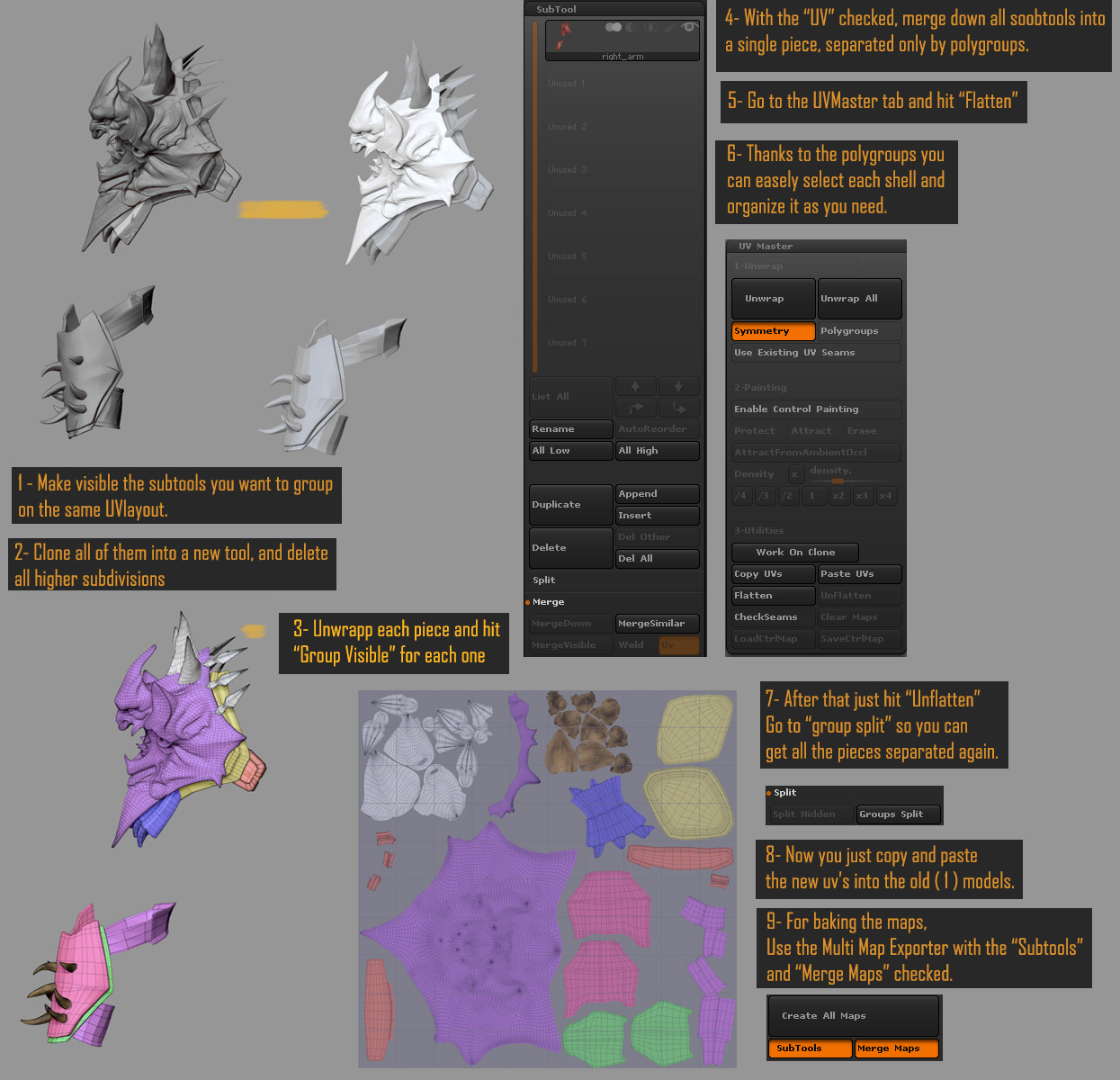 Used tons of Zbrush, for base sculpt, some retopology and Zremesh, final details and textures. Photoshop and Marmoset.